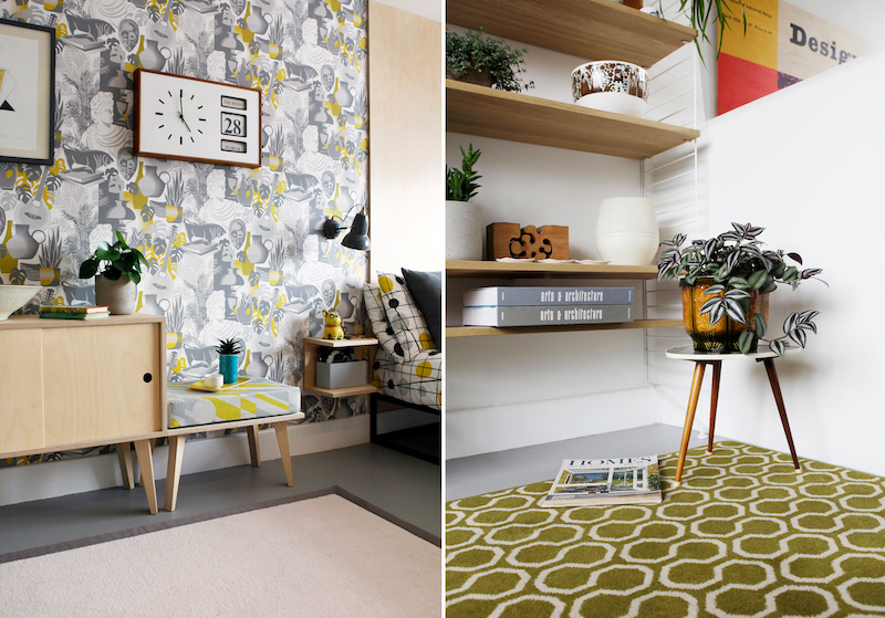 Mark:I was instantly drawn to the Quirky B Honeycomb Moss Carpet. Its soft olive green and interlocking geometry had exactly the mid-century feel that we needed to add richness and depth to the seating area of our living space. We have a collection of Portmeirion Totem crockery in olive green displayed on String shelving in the dining space, and the shade of this rug picks up on the display, echoing its colour in a different zone of the room.